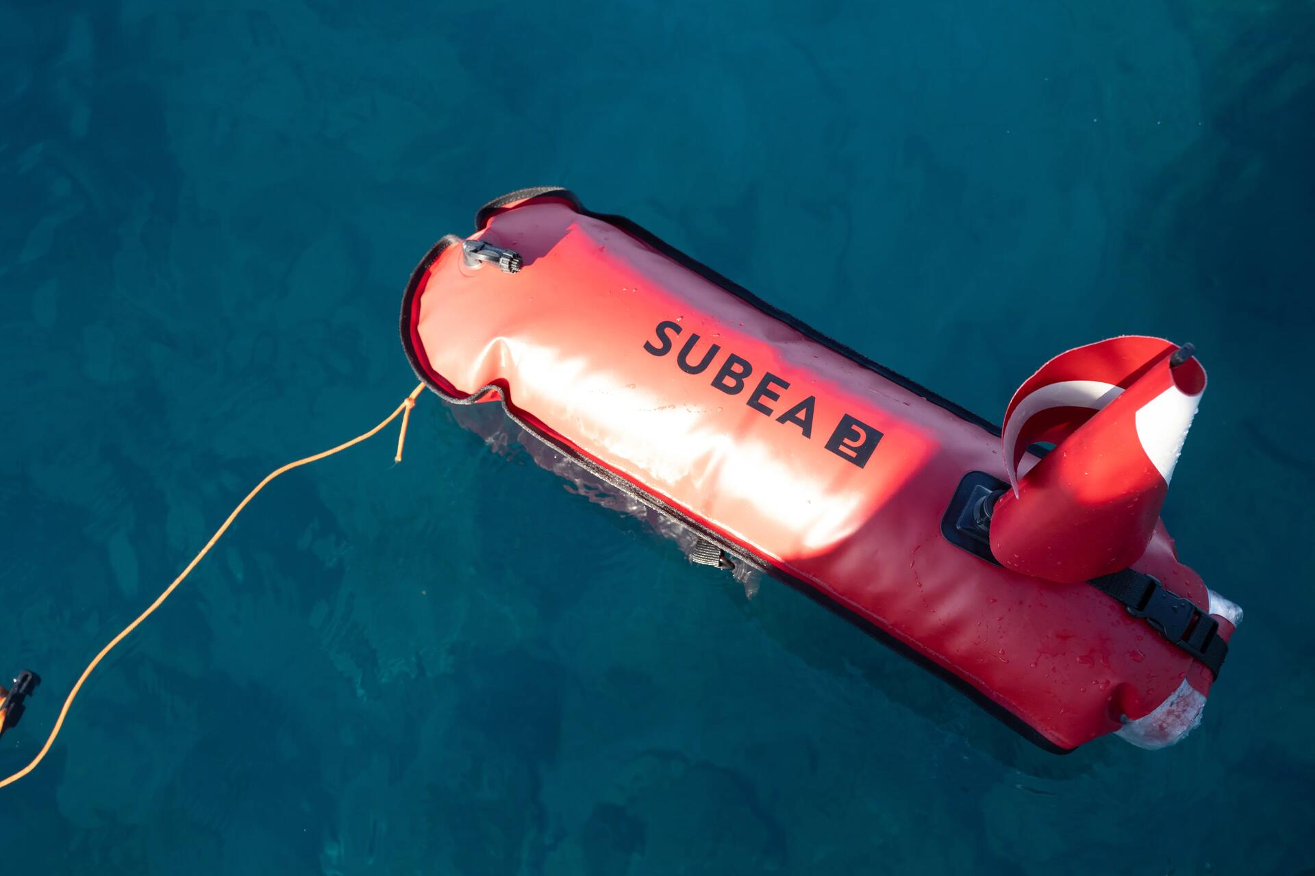 Et bien sûr la Bouée de chasse sous-marine de couleur réglementaire (orange ou rouge) et idéalement avec un drapeau alpha (blanc et bleu) ou un drapeau de plongée (rouge et blanc) pour signaler votre présence.