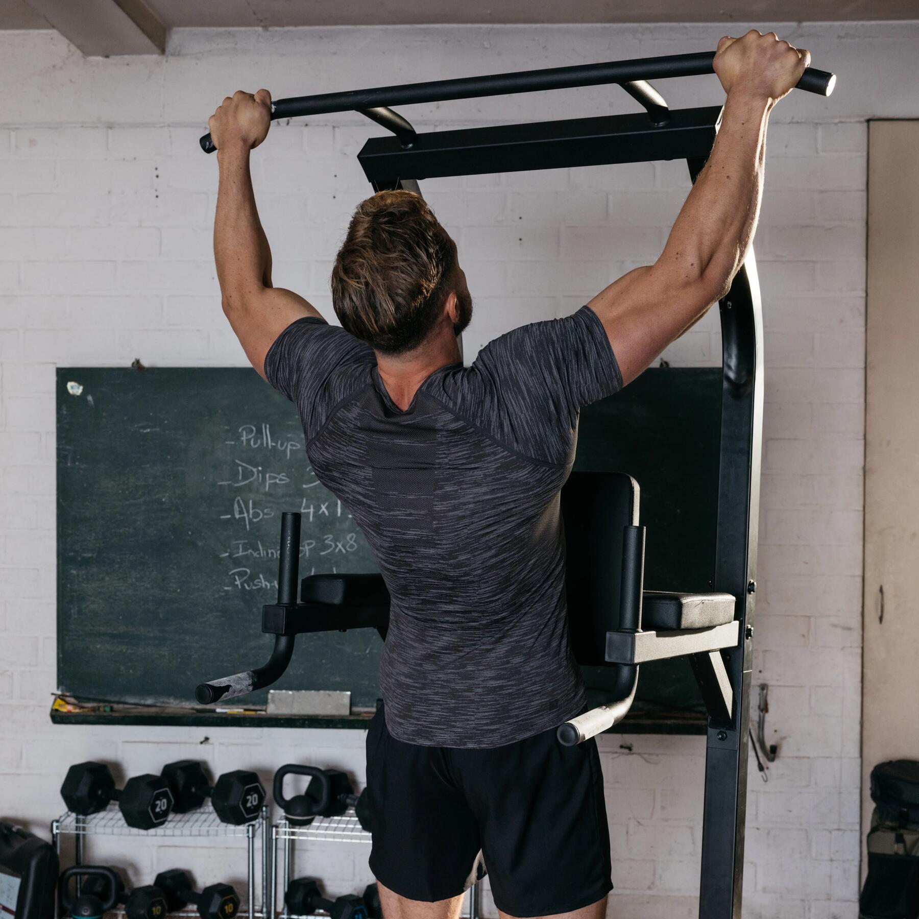 - Dips : ils ciblent les triceps, les pectoraux et les épaules, et permettent de développer la force du haut du corps avec une amplitude complète.