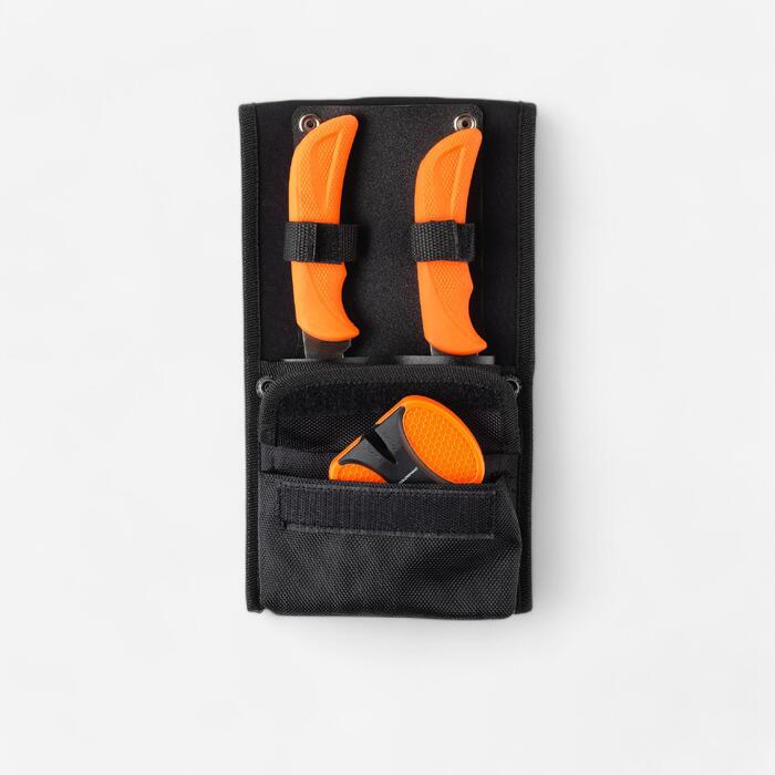 Kit de 2 couteaux et un aiguiseur rapide livré dans une pochette de transport résistante. 1 couteau spécial dépeçage et un couteau spécial filet et désossage.